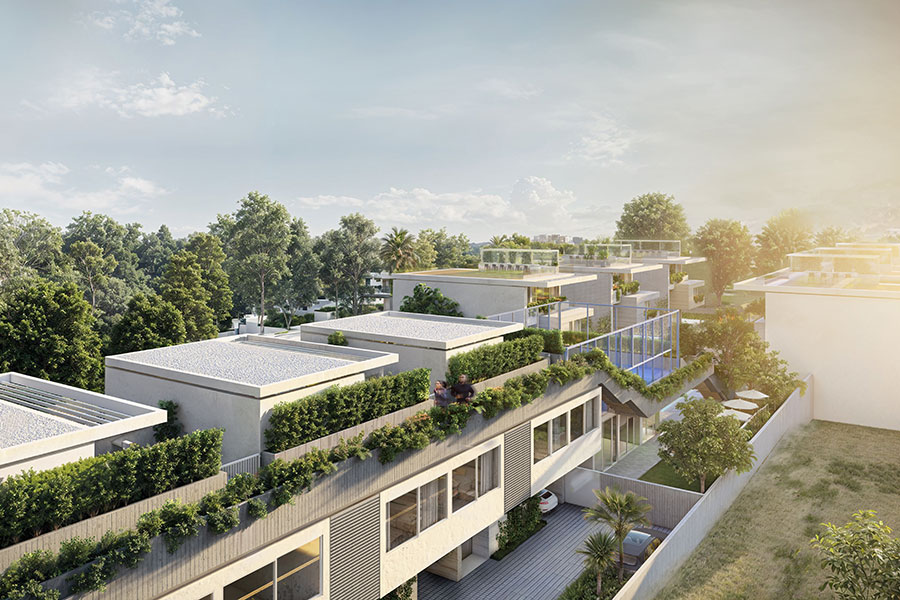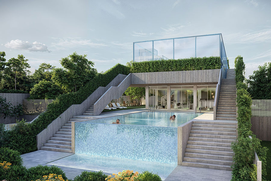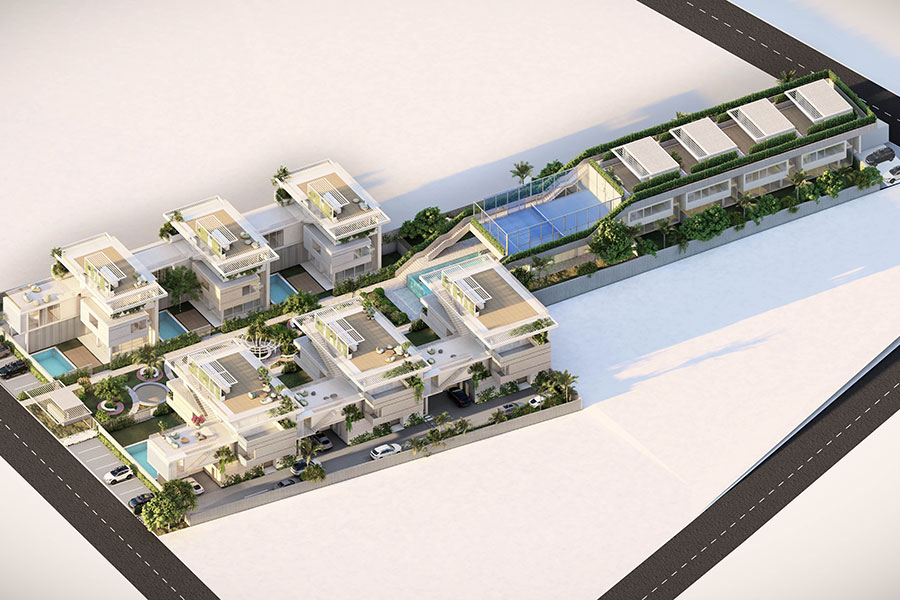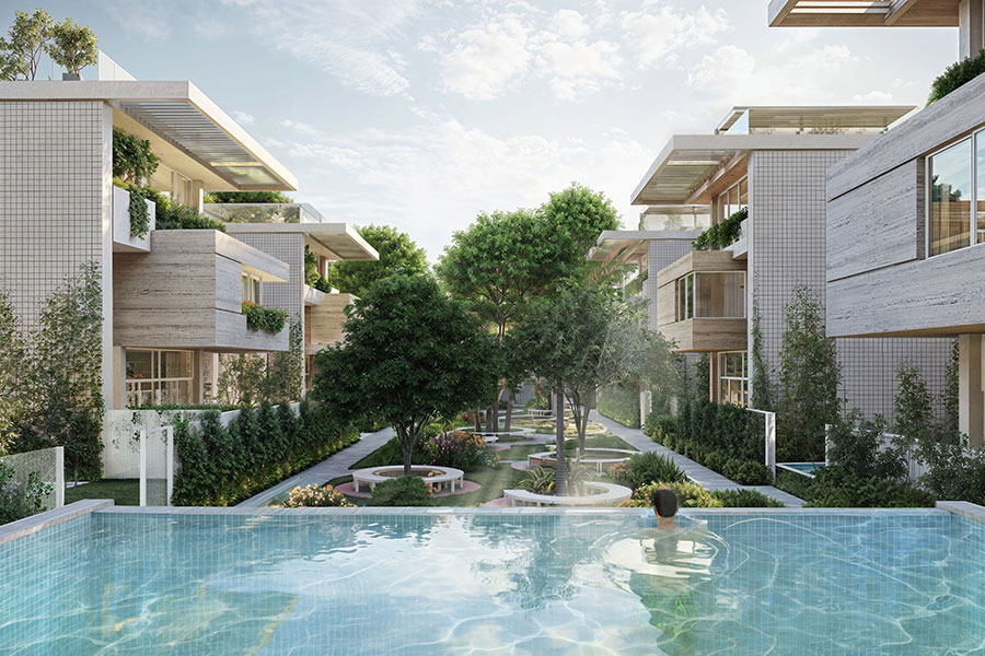 In contrast to the dispersed villa clusters, a linear building anchors the narrow edge of the site. This volume accommodates the four townhouses together with shared amenities, including a gym, swimming pool, and paddle court.