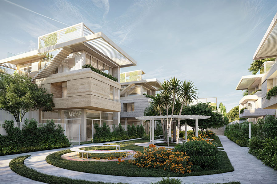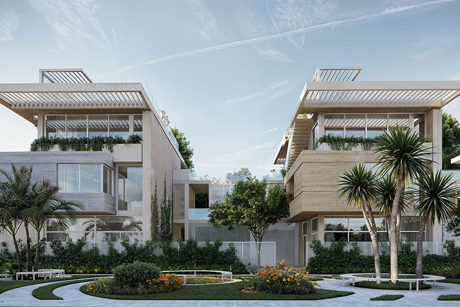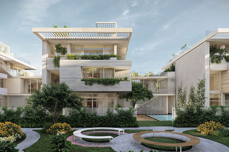 Vehicular access and circulation are deliberately relegated to the edges of the plot, freeing the heart of the site from traffic and allowing it to be fully dedicated to landscaped communal spaces. Within this protected interior, the villas are arranged as a series of fragmented clusters set around gardens, pedestrian paths, and water elements such as pools and reflective basins. This configuration fosters a calm and intimate atmosphere, where nature becomes the primary structuring element and daily movement unfolds through shaded walkways and open-air spaces. Each villa maintains a strong relationship with the outdoors, while carefully positioned setbacks and planting ensure privacy.